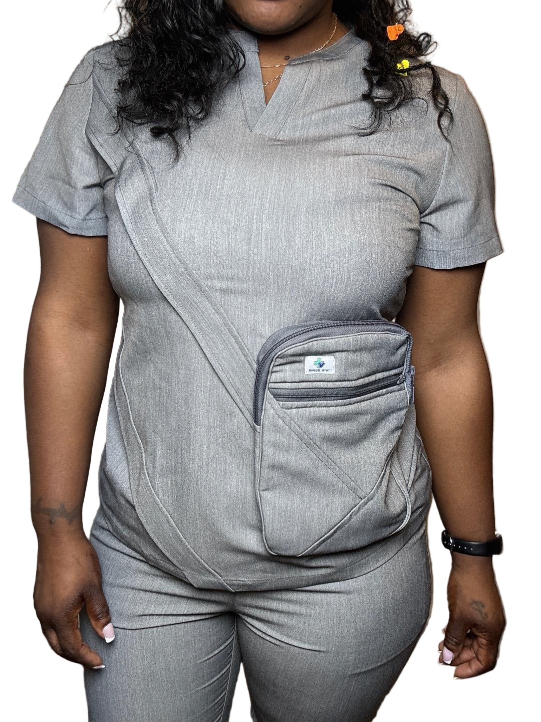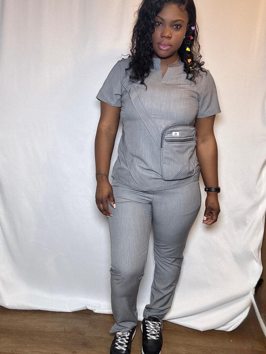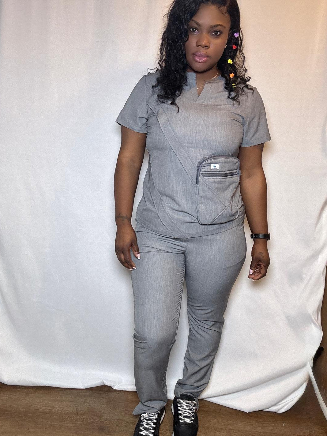 Minimalist design, maximum impact. The Sophia Scrub Set in grey features a sleek crew neck top, flattering straight-leg pants, and a built-in side purse for hands-free convenience. Crafted from a soft, stretchy blend that moves with you, Sophia is perfect for healthcare pros who want comfort, style, and functionality—all in one polished look.